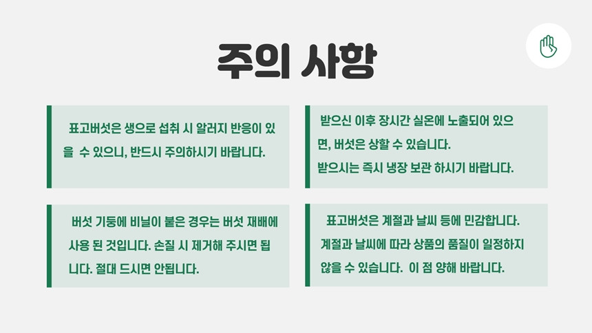 청정 밀양에서 1년 내내 수확하는 맛과 향이 깊고 쫄깃한 식감의 무농약 인증 받은 버섯!!